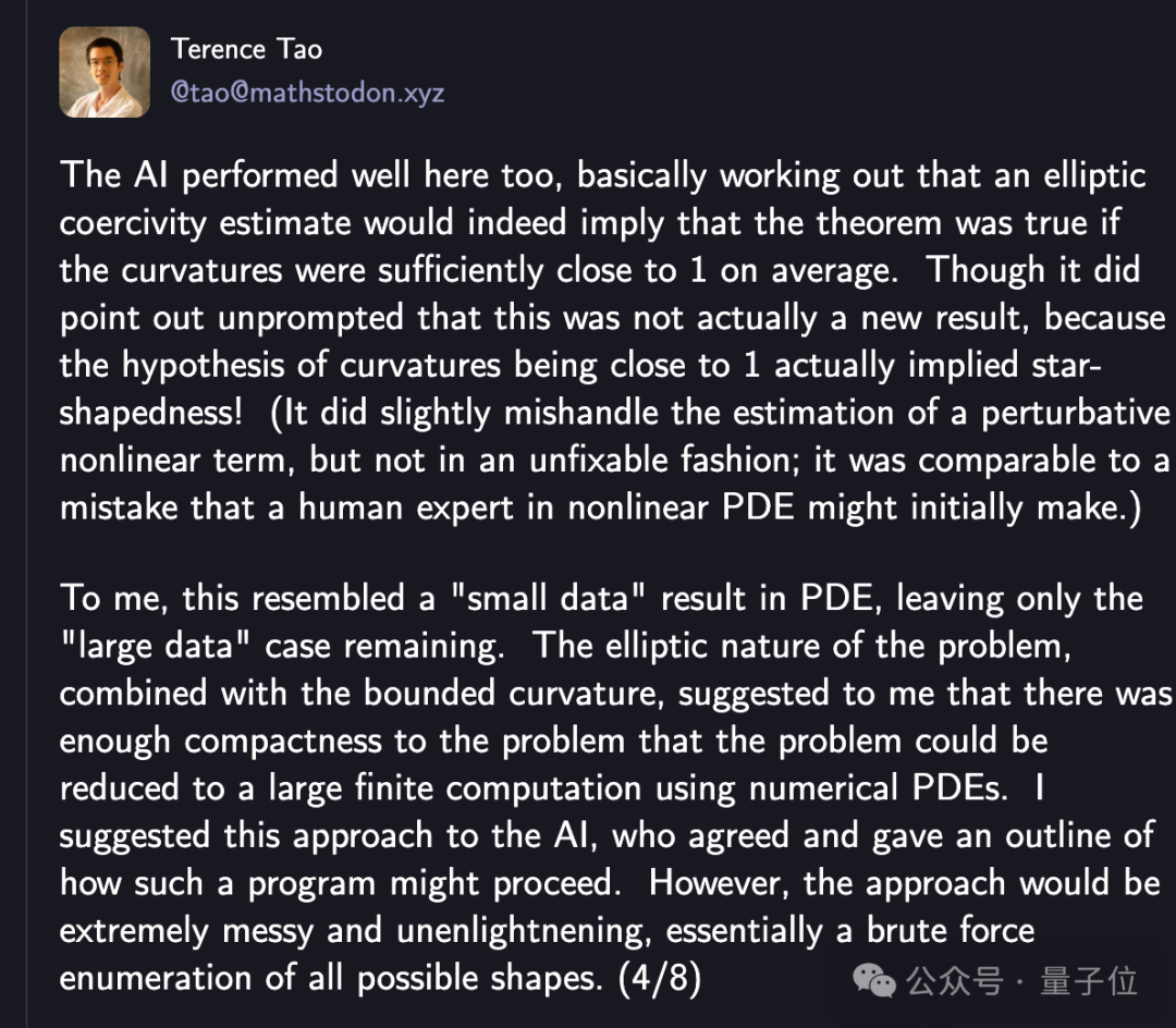 在“中等尺度”策略上,AI略微显得无益,它强化了陶哲轩对问题的错误直觉,而不是提出质疑。