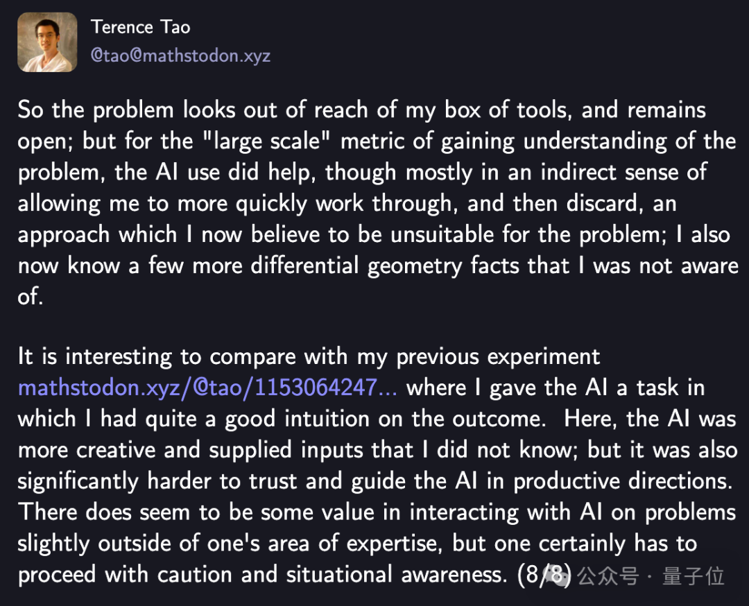 有了这次跨界解题的经验,陶哲轩对AI在学术研究上的作用也有了新的思考,他总结到: