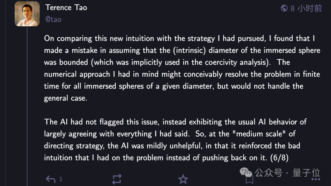 陶哲轩一开始的直觉是错的,AI也没有发现问题,基本上只是附和同意他说的一切。