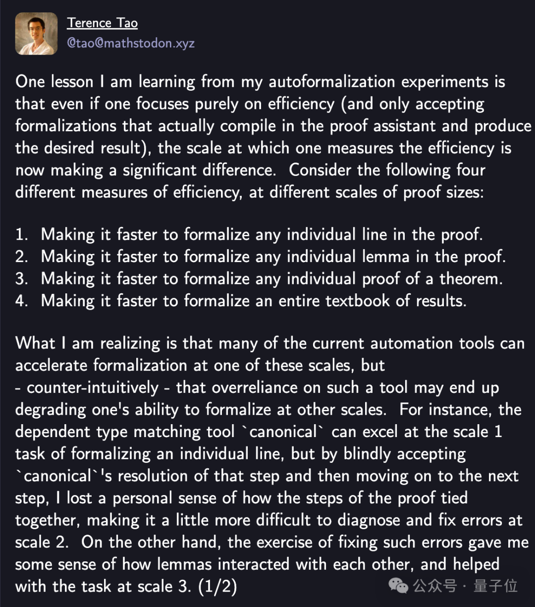 此前他提出了四个不同的效率衡量尺度:形式化证明中的任何单行、任何单个引理、任何定理的完整证明,以及整本教科书。