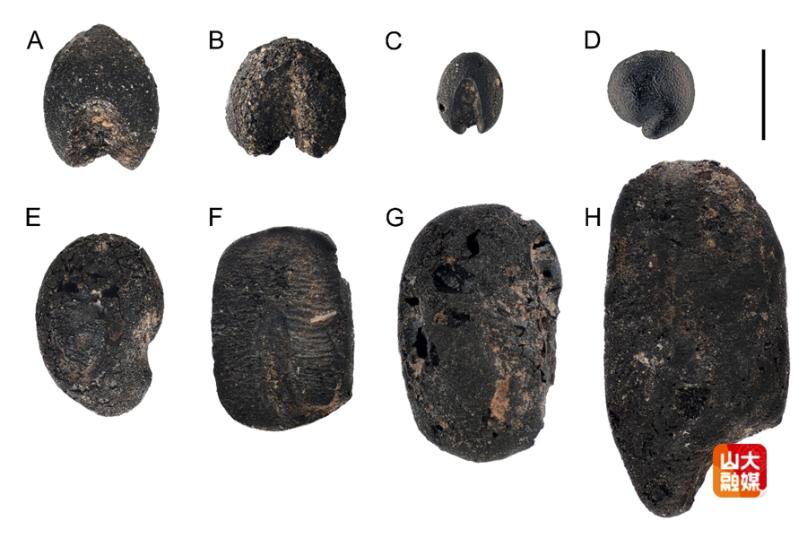 小斑遗址出土的炭化植物种子(A)黍(B)粟(C)狗尾草(D)藜(E)胡枝子(F)小豆(G)大豆(H)水稻。受访者供图