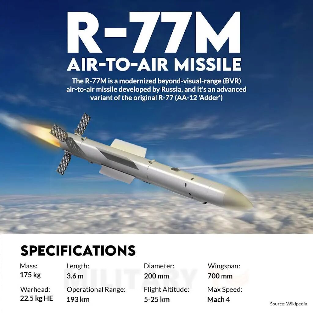 当然作为一款多用途作战飞机,俄罗斯人为苏-57配备了多种弹药,由于不知其内置弹仓的尺寸,也不知其是否可以在外部挂载弹药。所以,只能根据俄罗斯和其他国家媒体的报道,来做出判断和记录。从目前的记录来看,在执行空优作战中,苏-57将更多的是携带R-77M空对空导弹。作为R-77的改进和升级型号,R-77M的射程据说已经达到了190公里。此外,俄罗斯目前射程超过300公里的R-37M空空导弹,据说已经完成了体型“缩小”工作,所以苏-57内置弹仓可以搭载6枚。