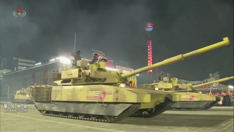 从地面装甲作战装备上,担纲主力的还是人民军自行研制的某款主战坦克。但相比先前的、曾在朝鲜劳动党建党七十五周年阅兵仪式上出现的“金玛塔”、“金布拉姆斯”主战坦克,此次出现的主战坦克,应当是今年在金正恩视察某兵工厂时出现的新型号。