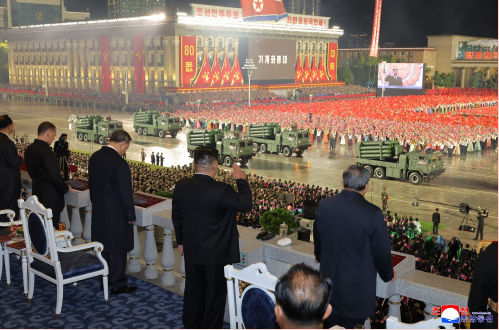 当地时间10月10日晚11时45分,朝鲜在平壤市举行庆祝朝鲜劳动党建党八十周年盛大阅兵式,金正恩与中俄等国的贵客参加。