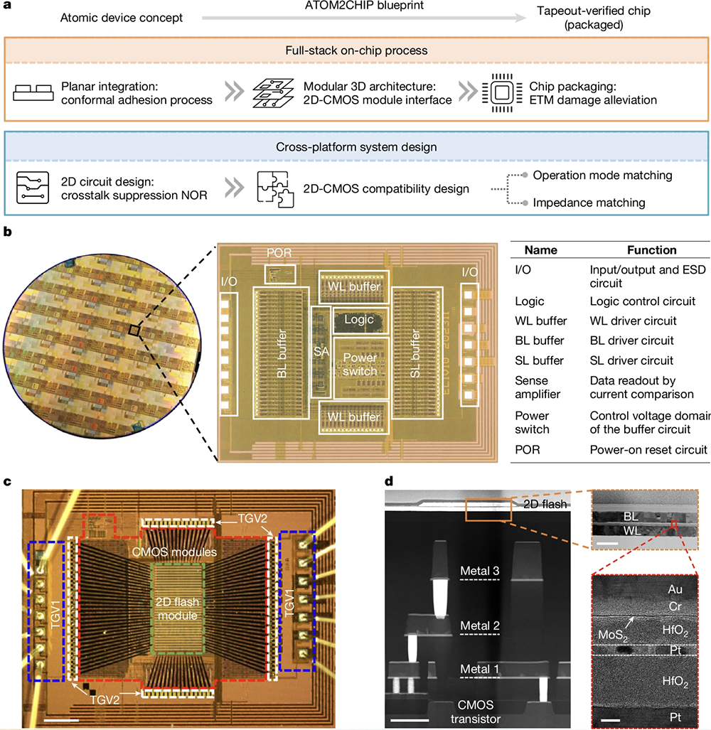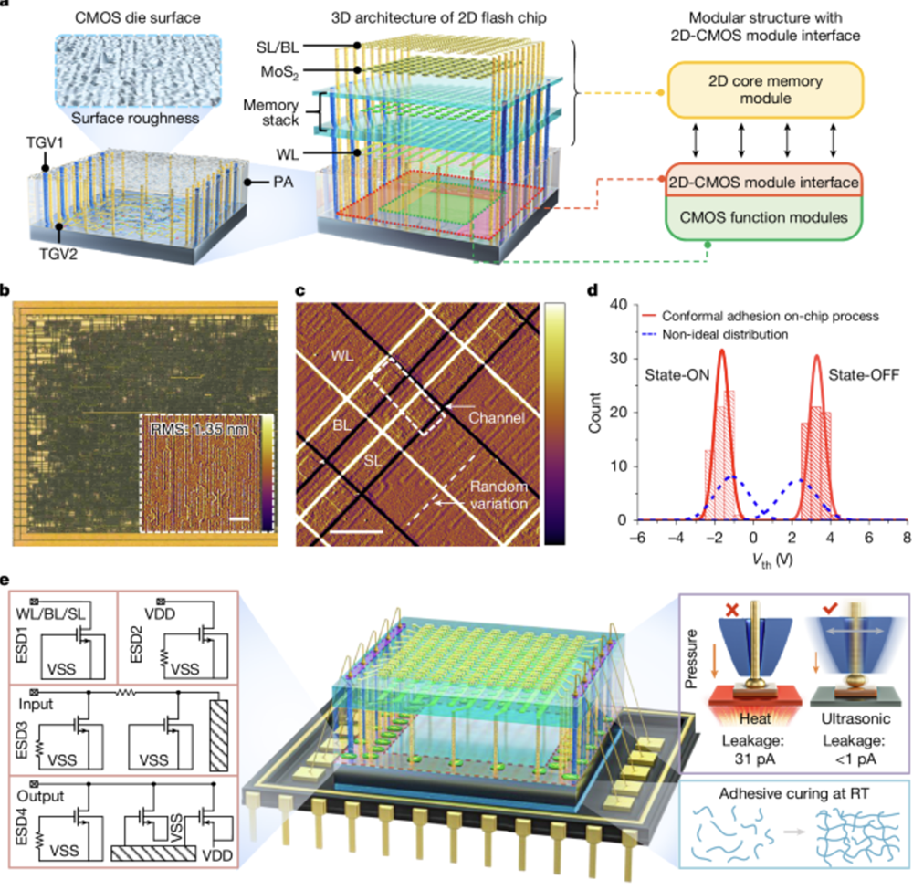 周鹏-刘春森团队决定从本身就具有一定柔性的二维材料入手,通过模块化的集成方案,先将二维存储电路与成熟CMOS电路分离制造,再与CMOS控制电路通过高密度单片互连技术(微米尺度通孔)实现完整芯片集成。