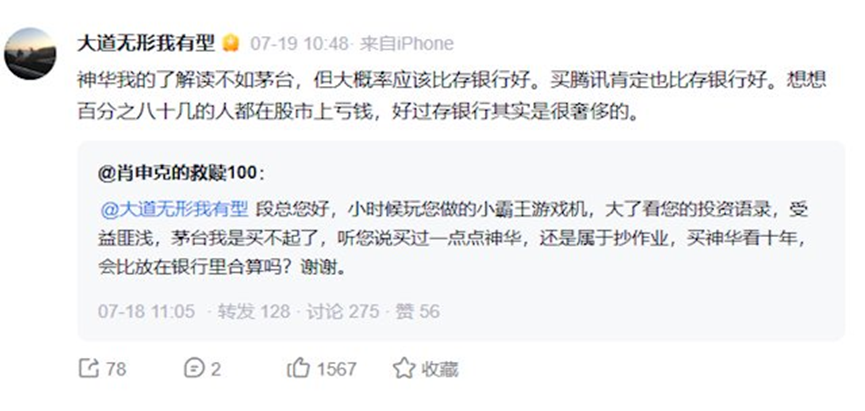 7月18日,有投资者向段永平提问,称自己买不起茅台股票,转而关注神华,询问持有十年是否比存银行合算。