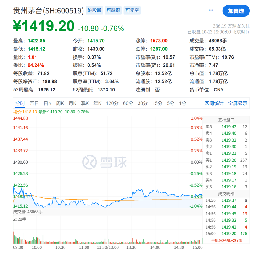 今年6月30日,当茅台股价承压下跌1.13%时,段永平曾发文鼓励投资者“大家在害怕什么呢?有点意思!”随后近三个月内,茅台股价从1403.9元涨至最高1538.02元,涨幅达9.6%。截至发稿,贵州茅台股价下跌0.76%至1419.2元/股。