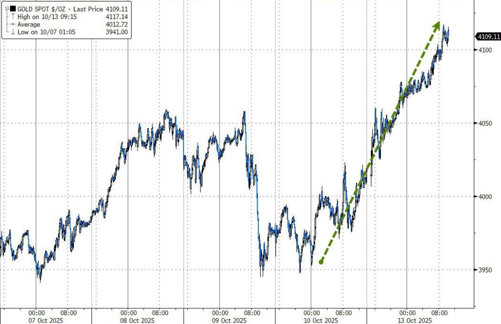 美股盘中,贵金属市场掀起狂潮。在轧空行情的推动下,COMEX白银期货日内涨幅一度扩大至6.5%,现货白银则突破52美元/盎司,再创历史新高。与此同时,现货黄金也强势突破4100美元/盎司关口,刷新历史高位。