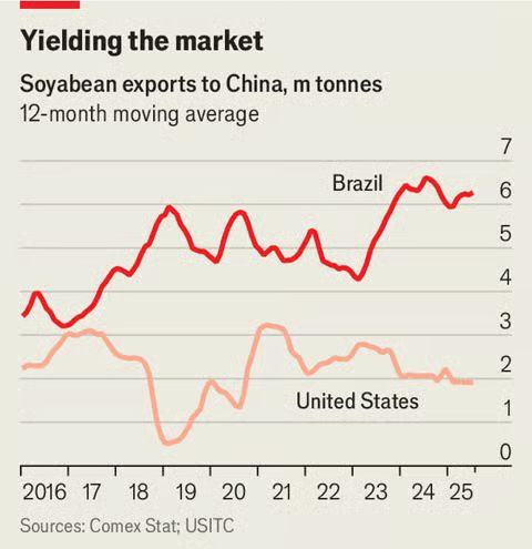 不过,巴西的好运或许将在10月底终结——届时将在韩国亚太经合组织(APEC)峰会期间举行会晤。川普已承诺,“大豆将是会谈的重要议题”。即便中国解除对美国大豆的禁令,美国向中国出口大豆的企业可能仍需缴纳高额关税:目前美国大豆的关税税率为23%,而巴西大豆仅为3%。但美国大豆价格正大幅下跌,即便叠加更高关税,其价格也将很快具备与南美大豆竞争的能力。若中美达成协议,哪怕只是部分降低中国对美大豆关税,都将削弱巴西的优势——至少在美国大豆价格再次上涨之前会是如此。