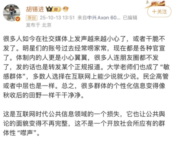 10月13日,胡锡进在微博发文称,很多人如今在社交媒体上发声越来越小心了,或者干脆不发了。明星们的账号过去经常唠家常,现在都是各种官宣了。体制内的人更是小心翼翼,很多人连朋友圈都不发了,发的话也是转发某个正规报道。大学老师们也成了“敏感群体”,多数人选择在互联网上能少说就少说。民企高管或者中层也是一样。总之,很多群体的个性化信息变得像秋收后的田野一样干干净净。