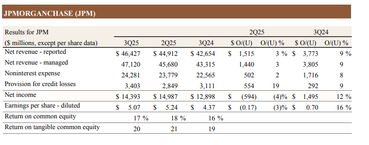 周二美股盘前,摩根大通发布三季度财报,财报显示,经调整后营收471.2亿美元,超出预估454.8亿美元;利润144亿美元,同比增长12%,超过分析师预测的137亿美元;每股收益5.07美元,同比增长16%;有形资产回报率(ROTCE)达到20%,较去年同期的19%显著提升。