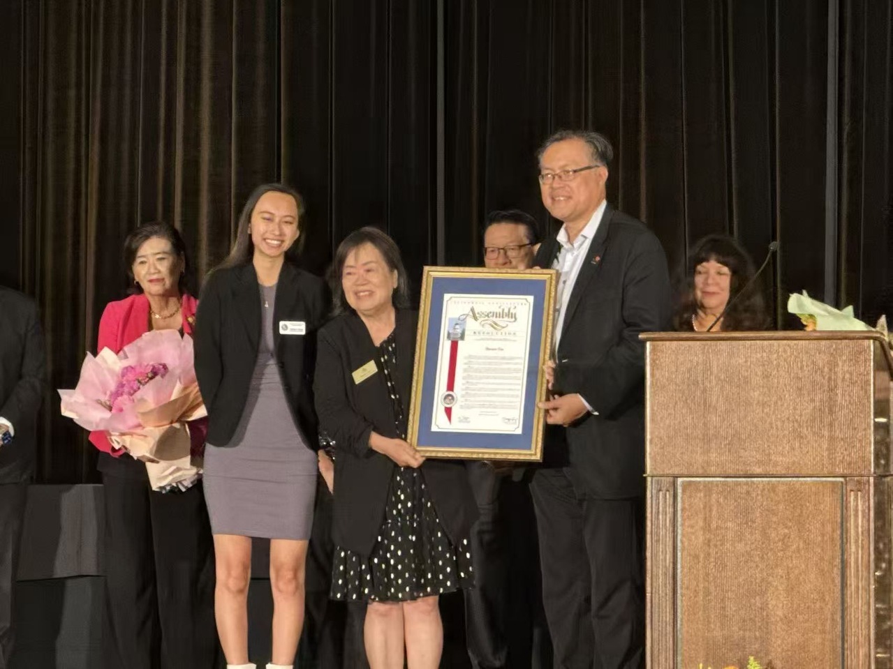 陈凤仪在近日亚裔青少年中心周年庆典上获得包括赵美心、加州众议员方树强、加州参议员Sasha Perez的表彰。她说,“非常荣幸。”