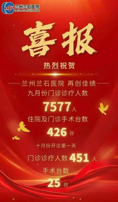 “喜报”内容显示,热烈祝贺兰石医院“再创佳绩”,9月份门诊人数7577人、住院及门诊手术台数426台,10月份开诊第一天门诊人数451人、手术25台。