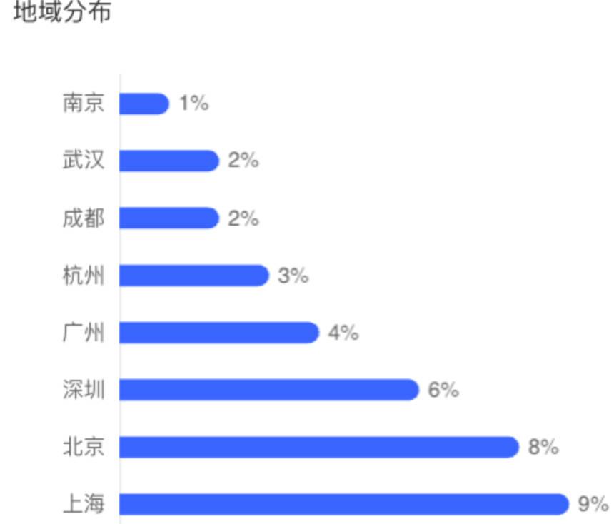 于此同时,我也看了下这些粉丝的地域分布。其中,大约20%的粉丝是来自大陆以外的地区,包括美国、加拿大、欧洲等。而来自中国的粉丝,集中在下列城市,主要是北京、上海、深圳、广州、杭州、成都、武汉和南京。