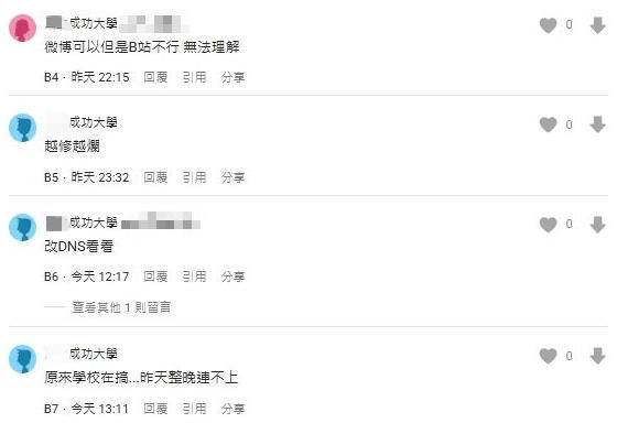 报道称,这场“B站遭封锁”风波,波及台湾成功大学、台湾政治大学、台湾中山大学等高校。