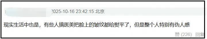 离开了大灯和浓妆,剧中出现怼脸镜头时,能看到吴越的面部肌肉已向下走,岁月痕迹比较重。然而,网友却没有因此“嫌弃”,反而大赞她尊重观众的眼睛,真人感十足,让人看着很舒服。