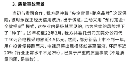 据乐视2022年披露的数据,当时约2万台事故电视需要售后处理,乐视不得不先行垫付巨额售后维修费用。期间,熊猫以“没有资材”为由,拒绝为55英寸事故机型提供换屏材料;2022年10月,承担97%订单量的东莞分公司突然关厂,仅提前5天邮件通知,没给任何售后方案,还迅速遣散了与乐视长期对接的管理团队。