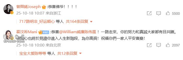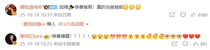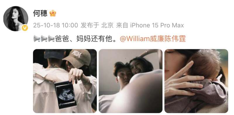 2025年10月18日,陈伟霆晒照官宣与何穗生子。