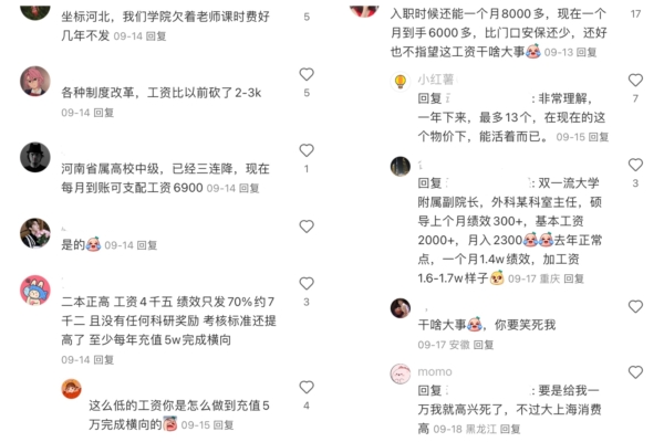 河南网友留言表示,“我们这一直穷,终于穷到了老师工资发不出的地步。”“省属高校中级(职称),已经三连降,现在每月到账可支配工资6,900元。”