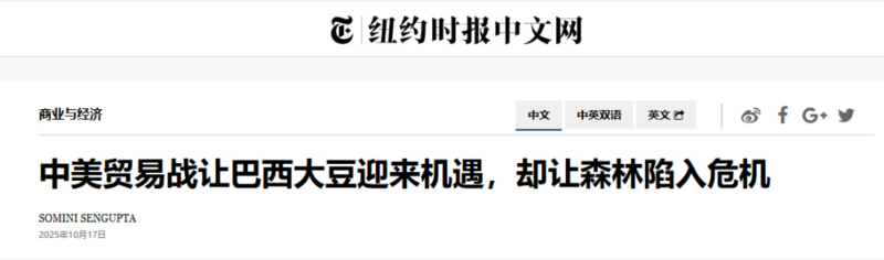 比如美国纽约时报的标题,就是《中美贸易战让巴西大豆迎来机遇,却让森林陷入危机》。