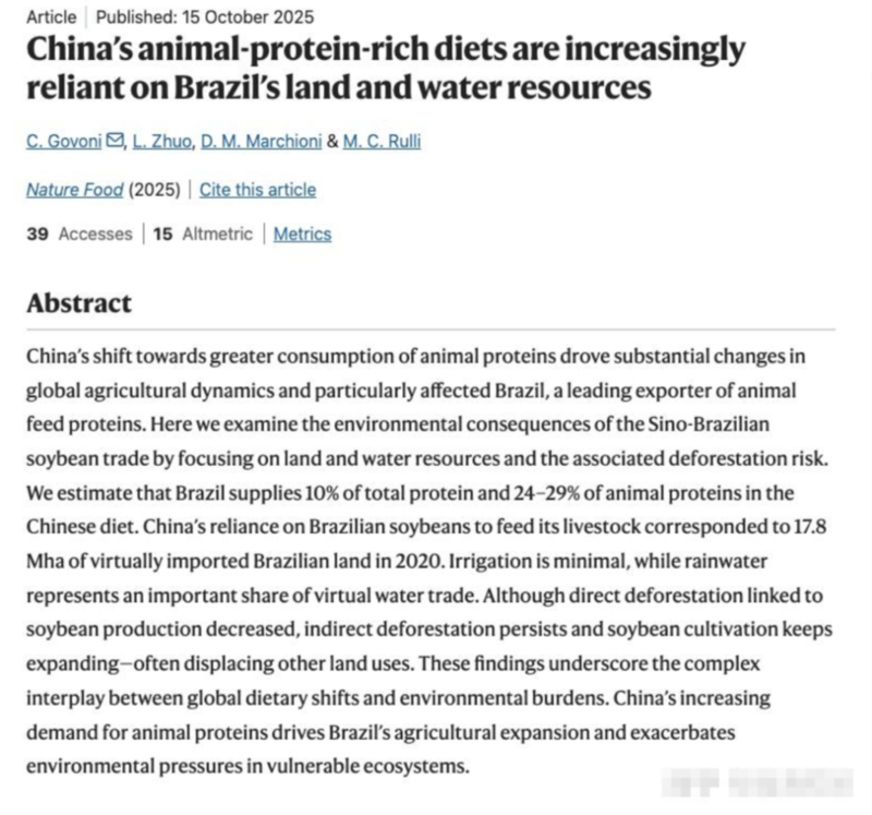 10月15日,国际顶刊《Nature》发布了一篇文章名为《China’s animal-protein-rich diets are increasingly reliant on Brazil’s land and water resources》的文章,汉语意思是《中国富含动物蛋白的饮食正日益依赖巴西的土地和水资源》。