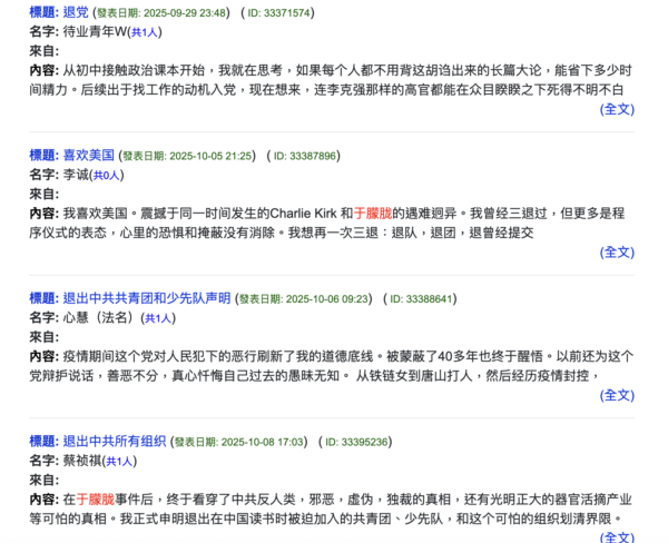 在海外退党网站,过去一个多月,越来越多的退出中共党团队组织的声明,与于朦胧有关。大纪元记者仅摘取部分声明: