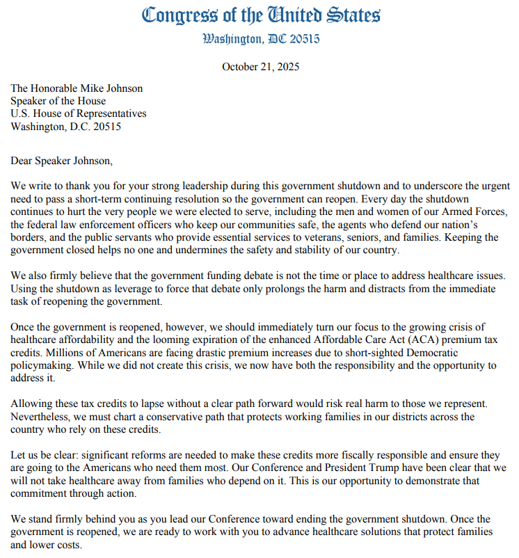 信中还写道:“我们坚信,政府拨款辩论并非讨论医疗政策的合适时机。以停摆为筹码强行推动这一议题只会延长损害,并分散人们对重启政府这一当务之急的注意力。然而,一旦政府重新开放,我们应立即将注意力转向不断恶化的医疗负担危机,以及即将到期的《平价医疗法案》强化保费税收补贴问题。”