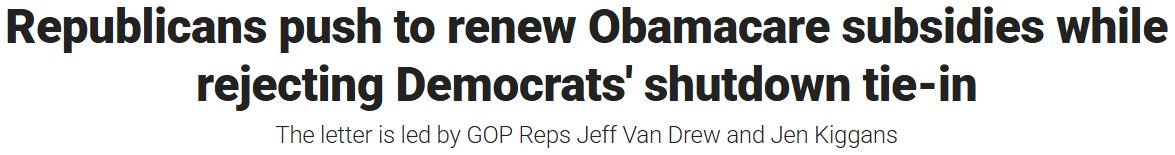 众议院和参议院的共和党领导层均表示愿意讨论医疗补贴到期问题,但拒绝将其与资助政府的法案挂钩——这项法案是一份旨在短期维持2025财年联邦开支水平的“持续决议案”(CR)。