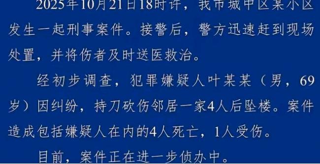 10月21日下午6点左右,广西柳州城中区一个小区发生了一起刑案。69岁的老人叶某某,持刀伤害了邻居一家4口,致3死1伤,随后他自己坠楼身亡。该事件就此造成了4死1伤的惨剧。