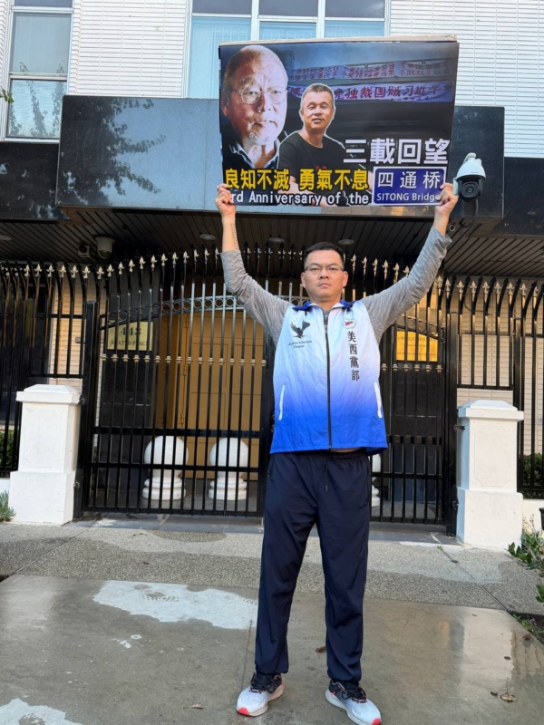 活动由洛杉矶中国民主党成员易勇主持。他在集会致辞中说,三年前的四通桥事件上不是孤立事件,而是一个刺破恐惧与沉默的火苗,是引发白纸运动与新公民行动的火种,“彭立发用个人的身体把真话带回公共空间,那一刻说明在高压下,真话依然能穿透监控与封锁,唤醒良知”。
