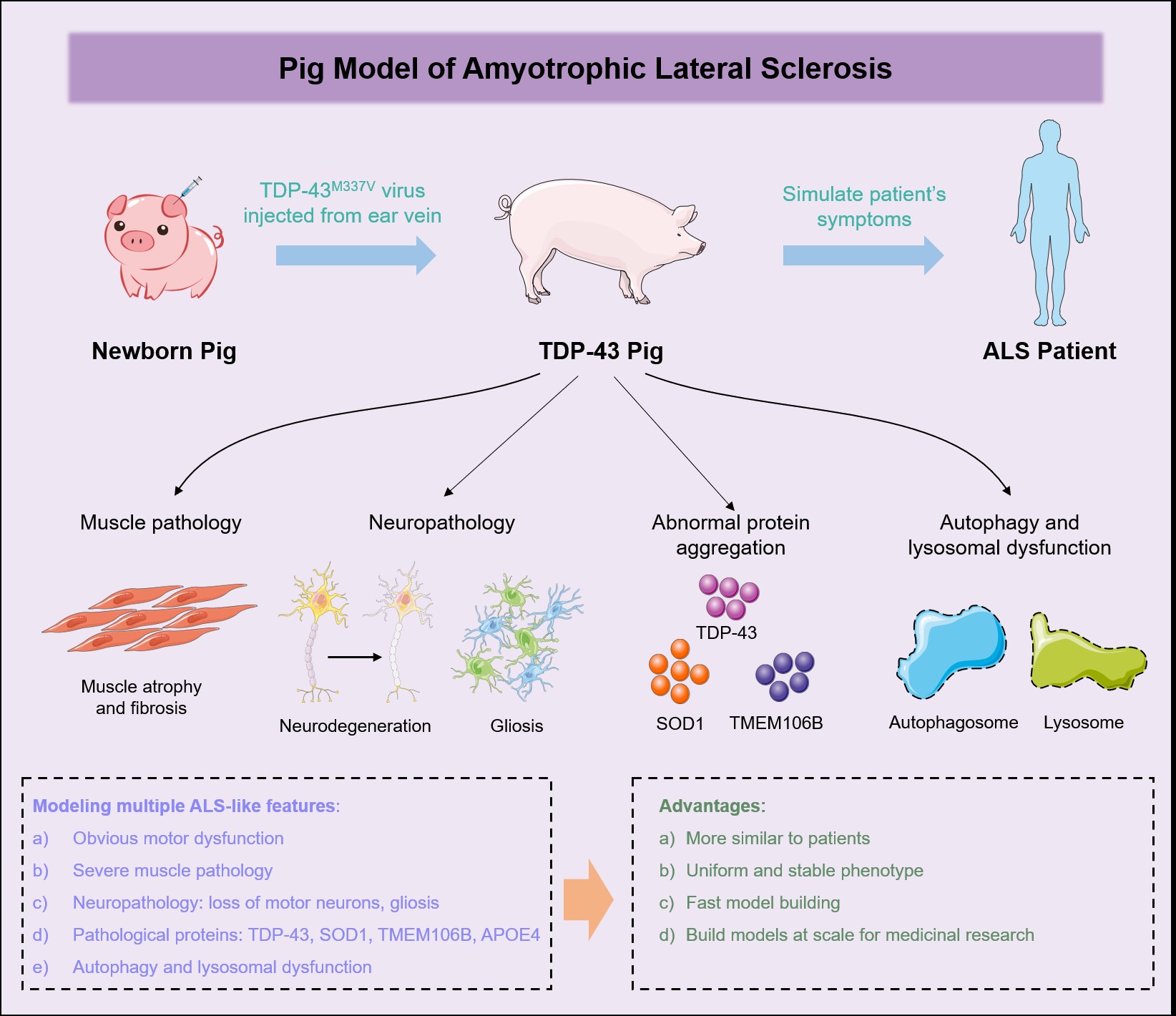 论文通讯作者闫森向《中国科学报》介绍,研究团队借助过表达TDP-43(M337V)的病毒载体,高效且稳定地构建出全新的ALS猪模型。该模型精准复现了ALS的多种标志性病理特征,为深入探究ALS中突变TDP-43驱动的致病机制,以及这些病理事件在疾病进展中的相互作用,提供了独特且宝贵的研究平台。