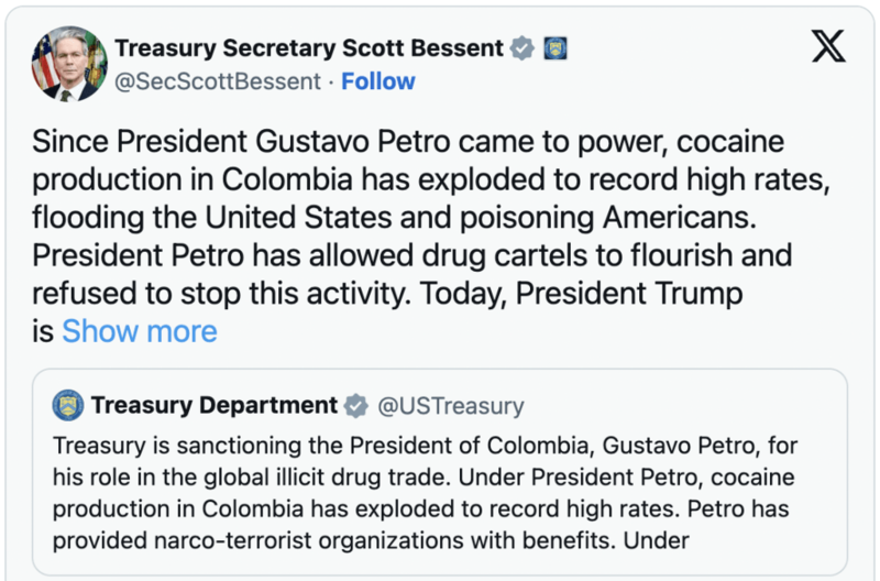 美国财政部宣布,因哥伦比亚可卡因产量激增并大量流入美国,决定对哥伦比亚总统佩特罗(Gustavo Petro)及其家人实施制裁,指其“纵容贩毒活动”,加剧美国毒品危机。佩特罗则强烈抗议,指美方指控毫无根据,批评华府“以虚伪之名惩罚反毒者”。
