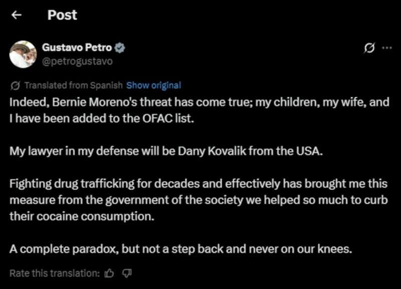 佩特罗随即发声明反驳,表示“我、妻子与孩子多年来致力打击毒品贩运,如今却被曾与我们合作的国家制裁,这是自相矛盾的决定”。他强调,制裁不会令他退缩,“我们不会屈服于任何压力”。佩特罗亦透露,美国律师Kovalik将为他提供辩护。