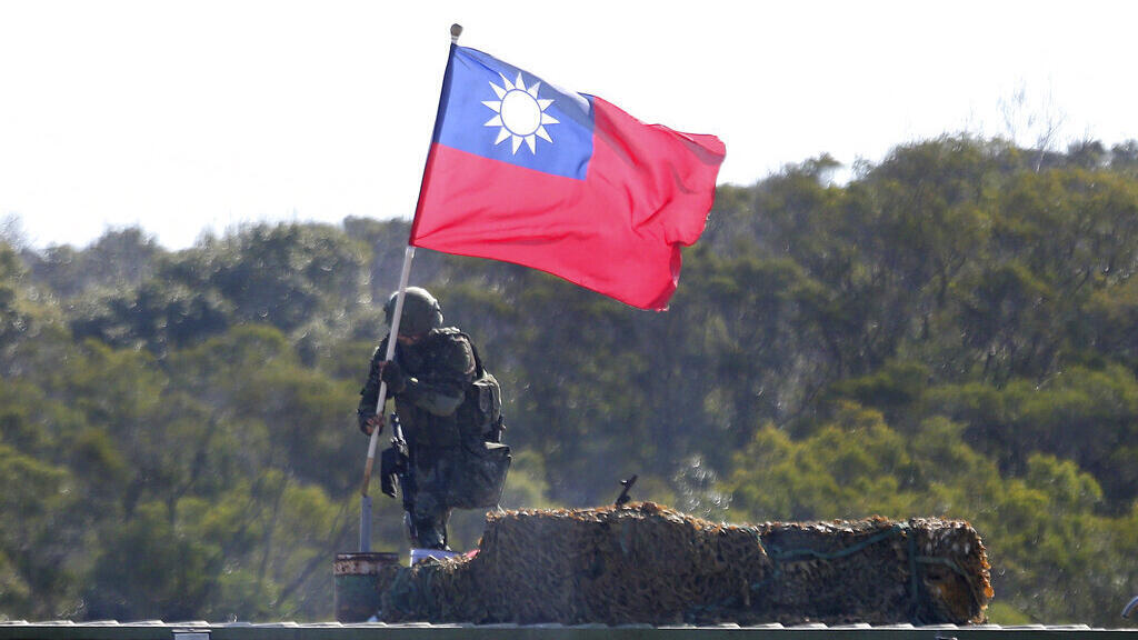 在这张2021年1月19日的资料照片中,一名士兵在台湾北部新竹县举行的一次旨在击退中国攻击的军事演习中手持台湾旗帜。 AP - Chiang Ying-ying