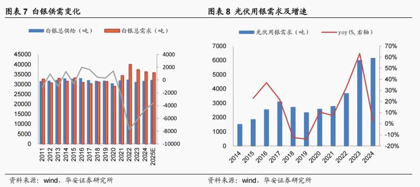 世界白银协会的数据显示,全球白银自 2021 年以来均呈现供不应求的状况,且预计2025年仍有3660 吨供需缺口。供需差主要来自光伏需求的提升,2024 年全球光伏用银量6147吨,2014至2024年间光伏用银需求量CAGR为15.09%。
