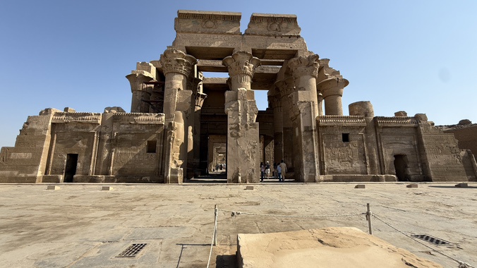 早上 8:30,我们从阿斯旺出发,沿着尼罗河一路向北前往卢克索。清晨的空气格外宁静,河畔偶尔传来几声鸟鸣。阳光洒落照亮了泛着金光的河面。一个多小时后,我们抵达了路上的第一站——科姆翁布神庙(Kom Ombo Temple)。