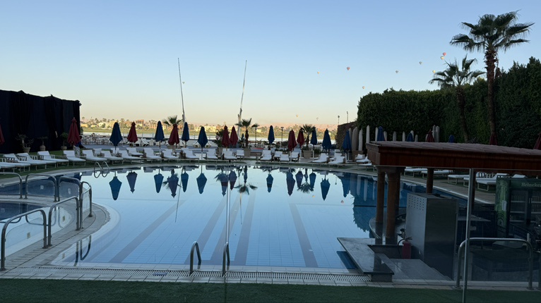 经过一路的颠簸,我们终于在傍晚时分抵达今晚的目的地——卢克索 Sonesta St. George Hotel Luxor,这是一家曾在2016年接待过中国国家主席习近平的酒店。入住酒店后,我们惊喜地发现房间被升级成了套房,左右两侧的窗户分别可以欣赏城市街景与尼罗河的美景。窗外,宁静的尼罗河上几艘传统的埃及帆船(Felucca)正悠闲地滑行,船帆在夕阳余晖下泛着金光。房间里还贴心地摆放了三块精致的蛋糕,让人倍感温馨。