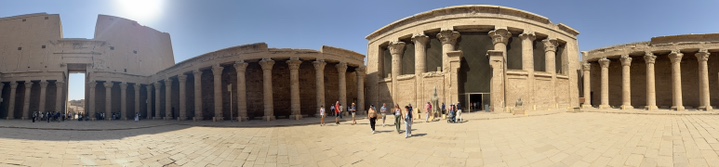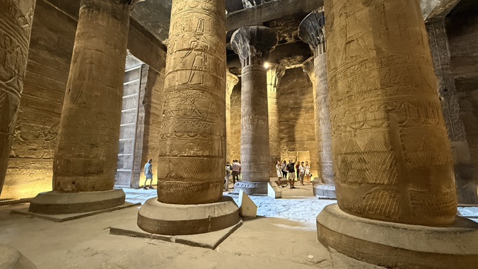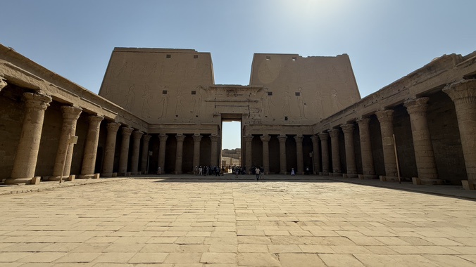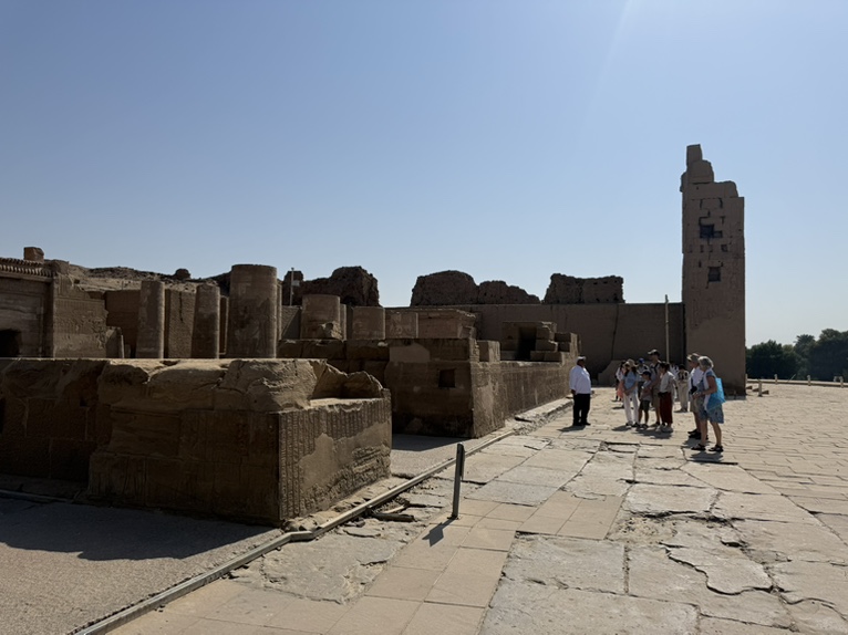 随后我们又开车一个多小时,抵达了著名的埃德夫神庙(Temple of Edfu)。这是古埃及保存最完整、规模仅次于卢克索卡纳克神庙的第二大神庙,供奉的是鹰头神荷鲁斯(Horus)——掌管天空与王权的神祇。整座神庙宏伟壮丽,石刻清晰,仿佛让人穿越回几千年前的辉煌岁月。