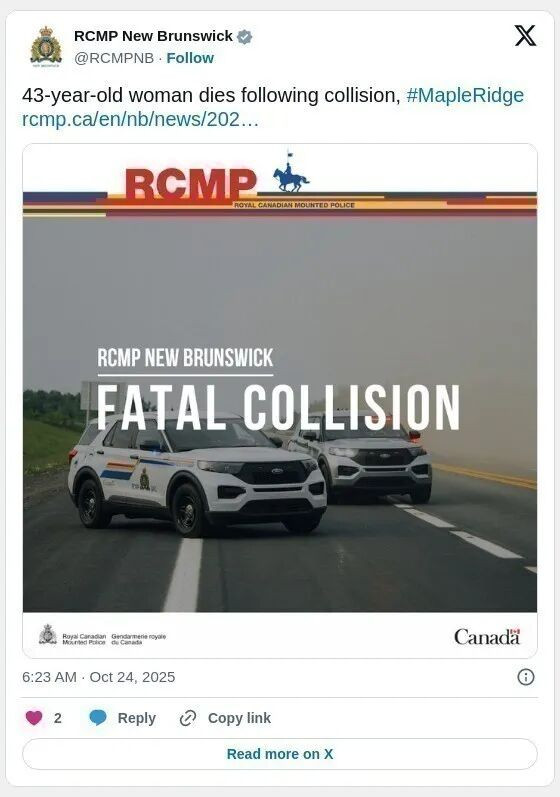加拿大皇家骑警发布的一份新闻稿称: https://rcmp.ca/en/nb/news/2025/10/43-year-old-woman-dies-following-collision: “据信,事故发生时,一辆沿 605 号公路向南行驶的车辆撞上了一只鹿,鹿随后又冲向了一辆向北行驶的车辆,该车的驾驶员是一名 43 岁的女性”。