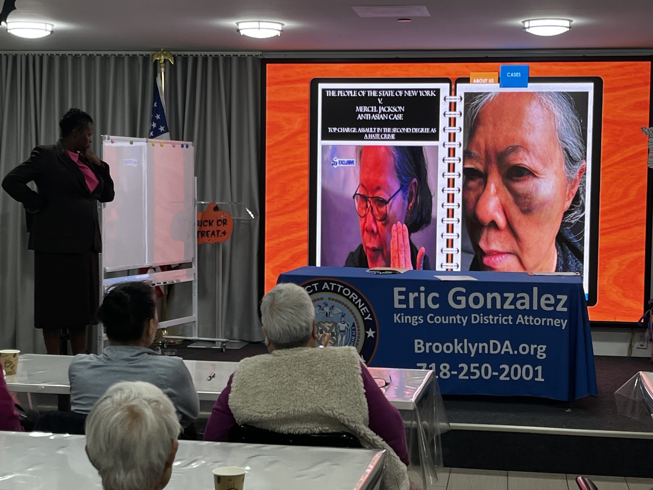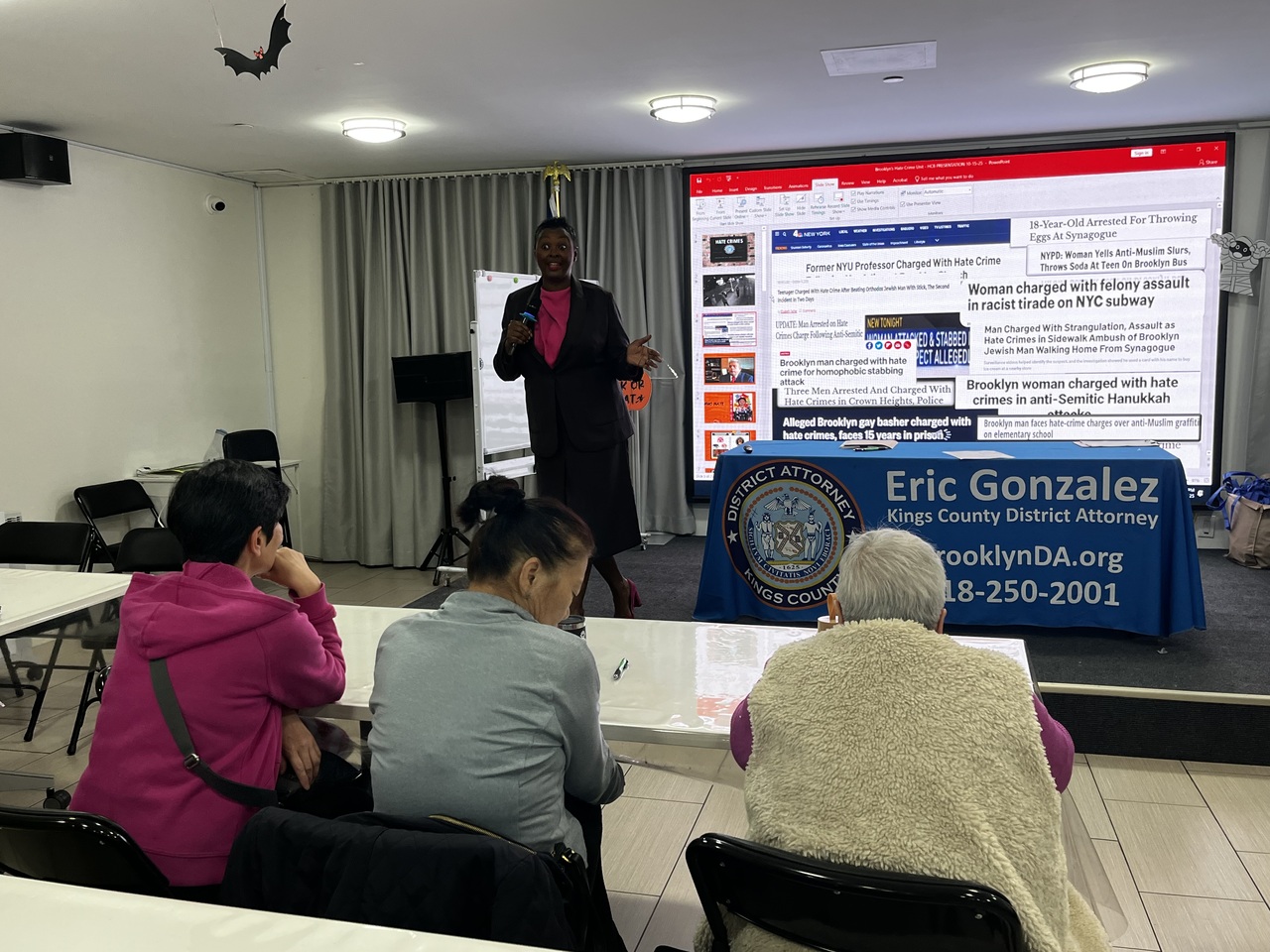 布碌仑(布鲁克林)地区检察官蒋沙乐(Eric Gonzalez)办公室日前来到松柏之家多元化社区服务中心,举办有关仇恨犯罪的讲座,介绍如何区分和认定仇恨犯罪,起诉仇恨犯罪有什么程序,以及布碌仑仇恨犯罪的情况。共有数十名松柏之家的会员参加了这次活动。