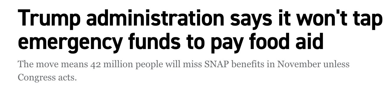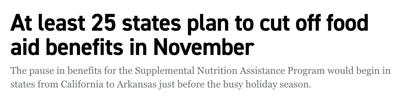 首先受影响的是SNAP食品援助项目,这是美国最庞大的反贫困计划之一,为超过4000万人提供食品补助。根据农业部估算,如果国会无法在11月1日前恢复拨款,至少25个州将不得不削减福利额度或暂停发放。