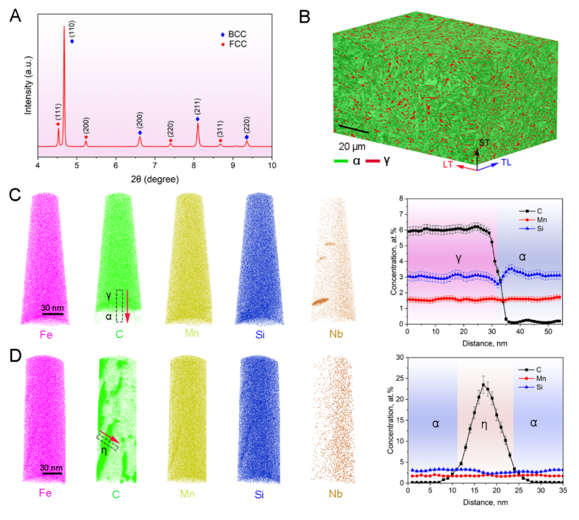 基于前期发现的位错越过马氏体/奥氏体界面(DAMAI)现象,研究团队设计并制备了一种低成本的高碳“淬火-分配-回火”(Q-P-T)钢。该材料主要由贫碳的回火马氏体(α:其中奥氏体是高温下形成的面心立方结构高韧性相)和稳定的富碳残留奥氏体(γ: 马氏体是淬火过程中形成的高强度相)组成。