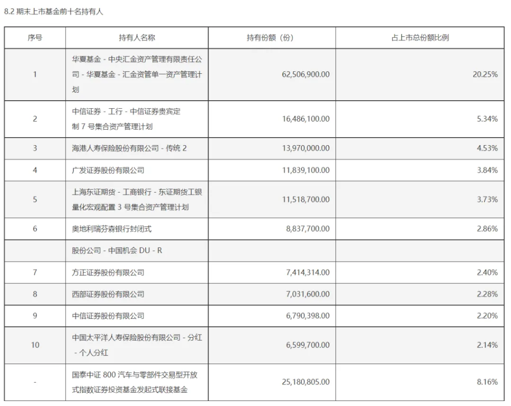 截至9月30日,机构1持有国泰中证800汽车与零部件ETF降为6170.69万份。结合基金中期报告、三季报分析发现,机构1即为“华夏基金-中央汇金资产管理有限责任公司-华夏基金-汇金资管单一资产管理计划”。