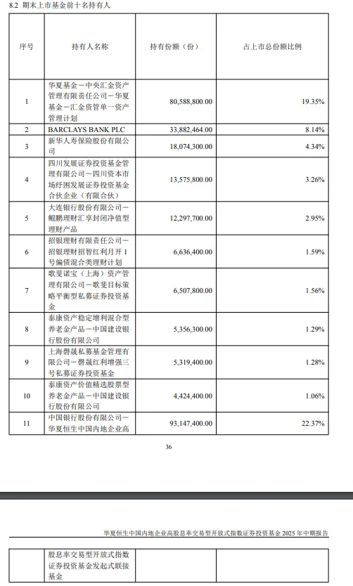截至6月30日,“华夏基金-中央汇金资产管理有限责任公司-华夏基金-汇金资管单一资产管理计划”出现在18只ETF前十大持有人名单中,共持有32.96亿份。