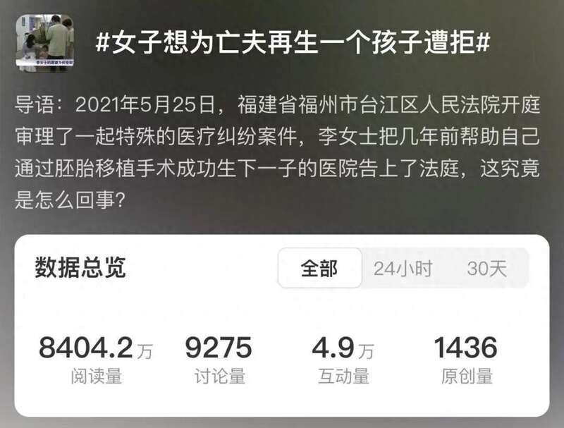 近日,话题#女子想为亡夫再生一个孩子遭拒#冲上热搜第一,引发广泛关注。