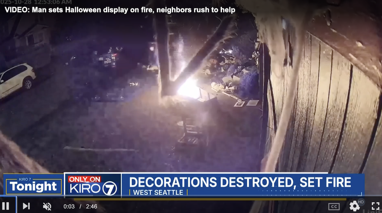 就在西雅图的万圣节气氛渐浓之际,一场突如其来的火光打破了节日的欢乐。周二(28日)凌晨,一名男子被摄像头拍到故意点燃一户人家的万圣节庭院装饰,现场火光冲天,险些引发更大火灾。