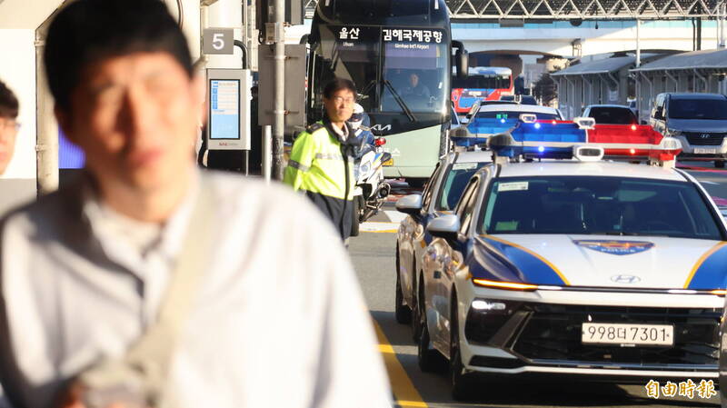 美国总统川普与中国国家主席习近平今天将在釜山金海机场会晤,外围有大批警力戒备。(记者黄靖媗摄)