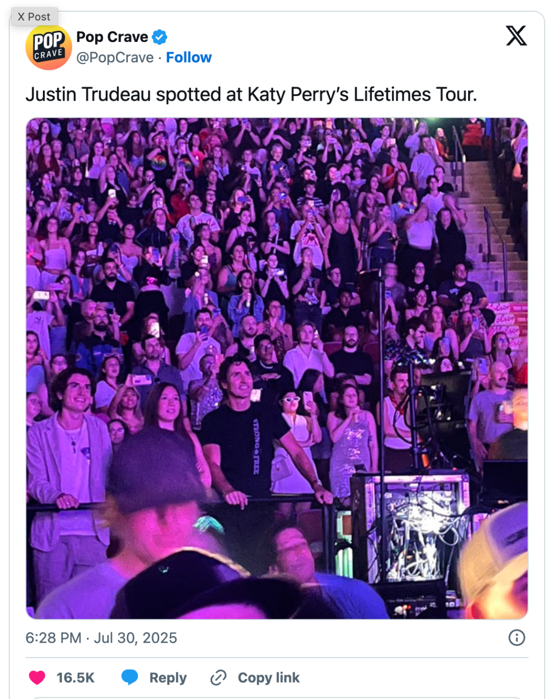 两天后,特鲁多带着女儿 Ella-Grace 出现在佩里“Lifetimes”巡演的蒙特利尔站观众席中。
