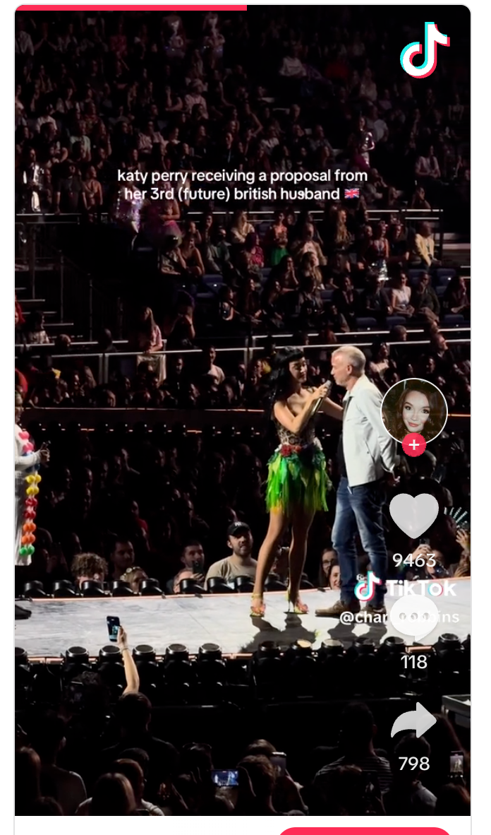 在伦敦演唱会上,一位粉丝上台向佩里求婚。佩里笑着回应时,开玩笑暗示自己“最近已经不单身了”。