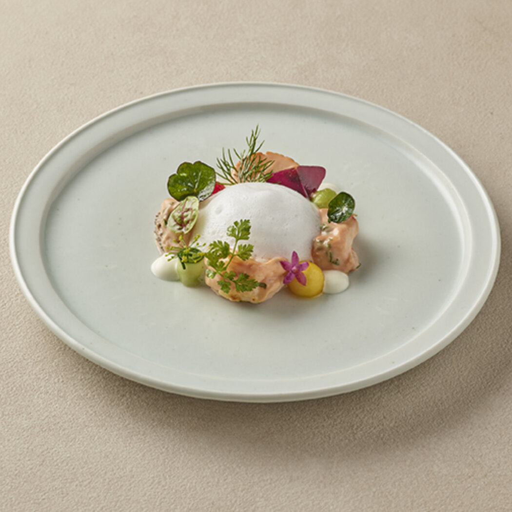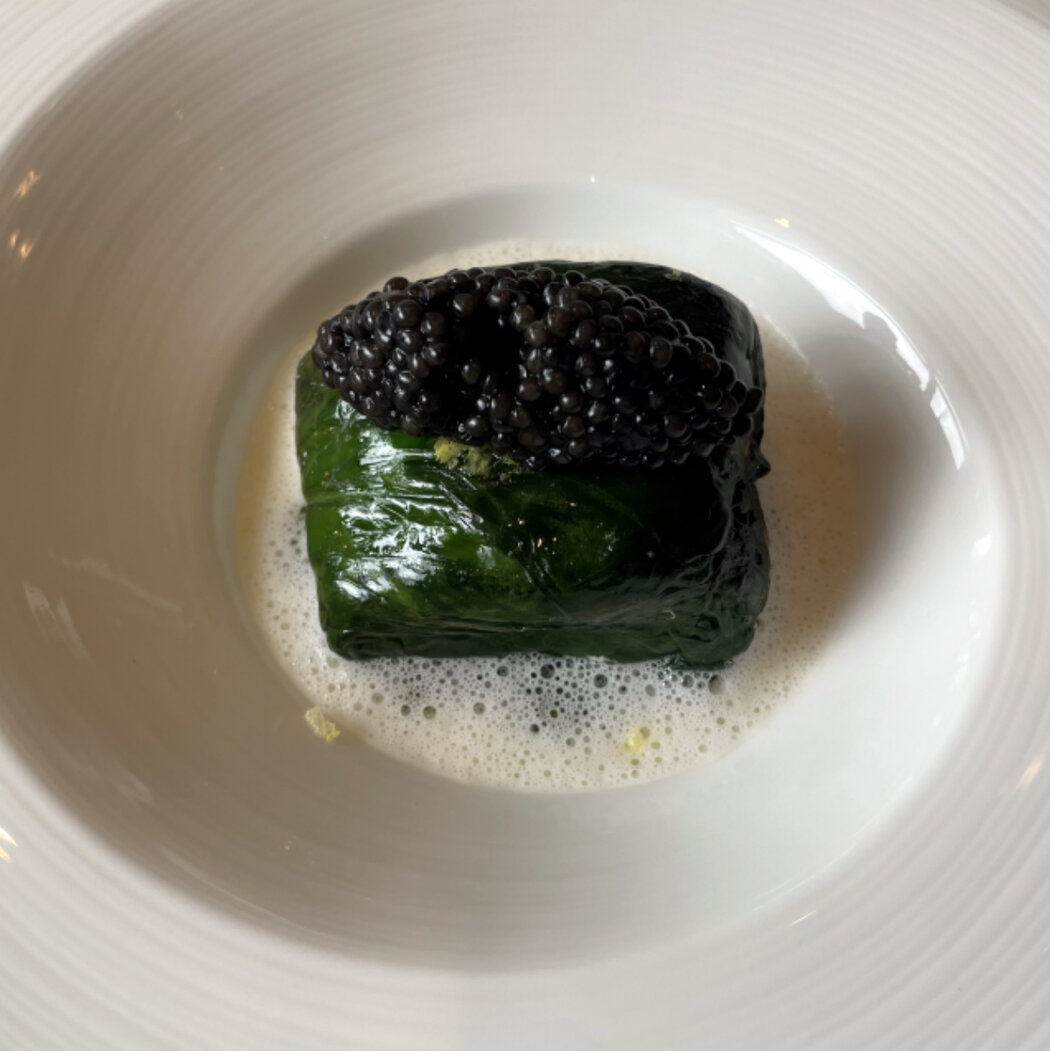 周三晚餐上的比目鱼、海藻奶油浓汤和韩国鱼子酱。 South Korean presidential office